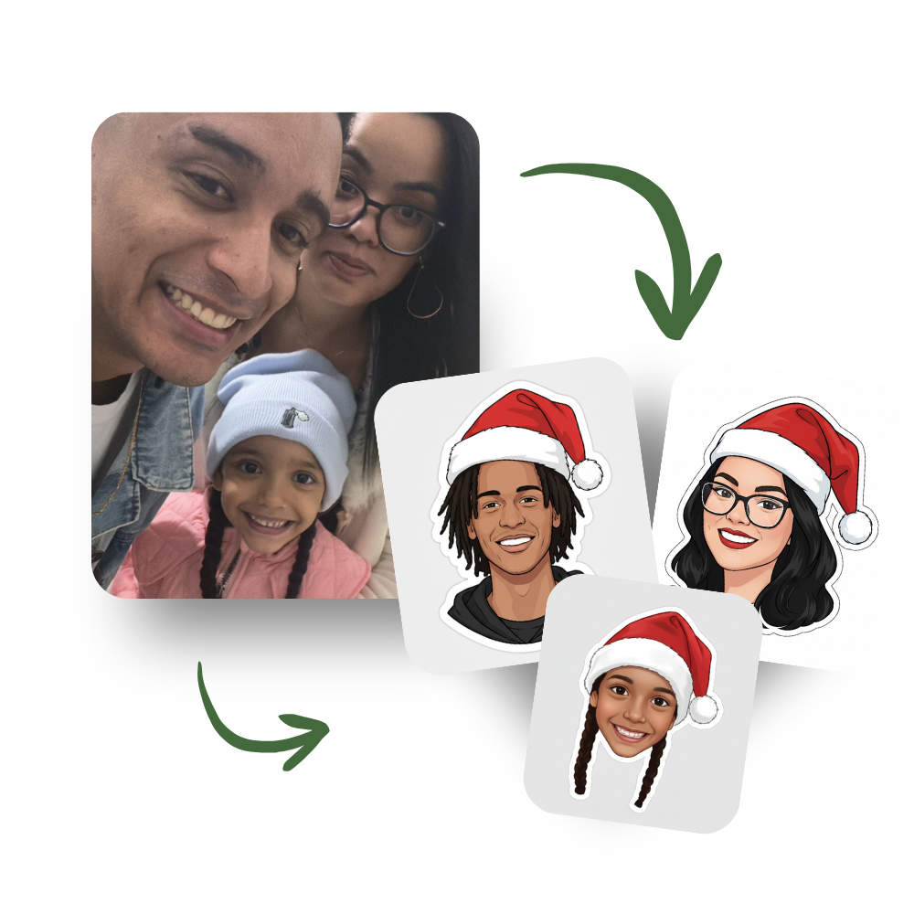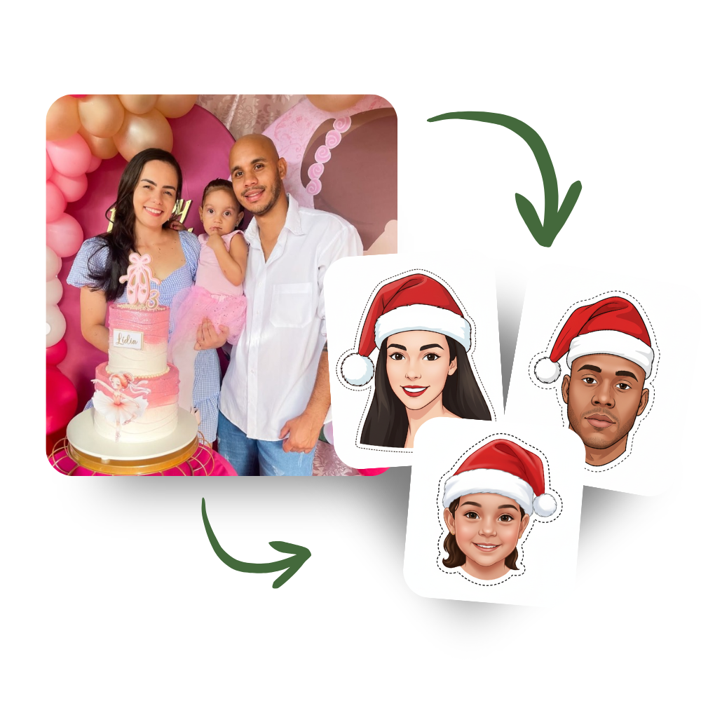 Você acessa o app, envia uma foto e recebe a arte pronta em segundos. Depois é só baixar e imprimir.